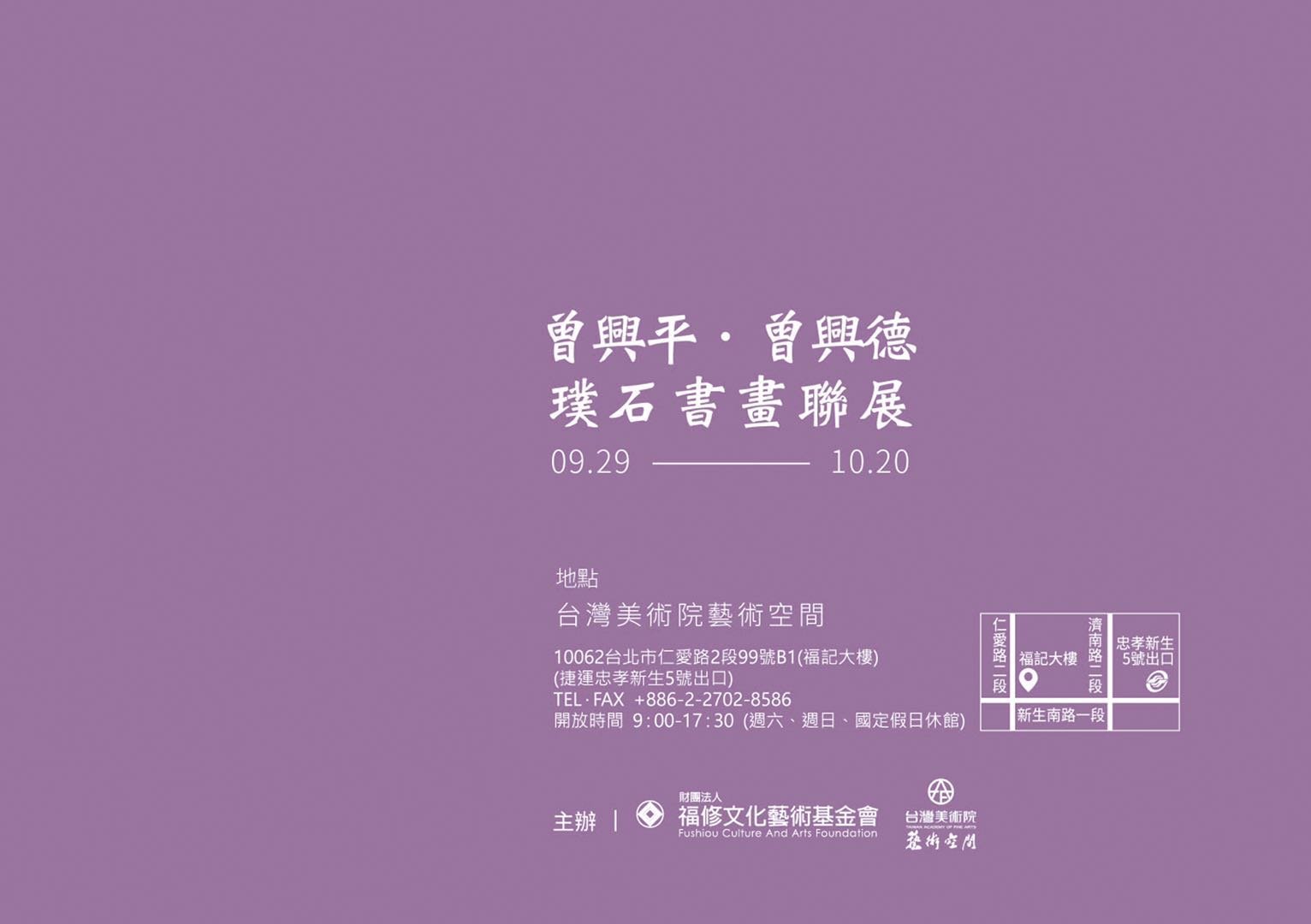 本站新聞 曾興平、曾興德 璞石書畫聯展 Super User 本站新聞 10 September 2020 Hits: 921 Print Email 展覽日期:2020.9.29~10.20地點:台灣美術院藝術空間 AM9:00~PM17:30 (台北市仁愛路2段99號B1),捷運忠孝新生站5號出口 Prev Next tweet